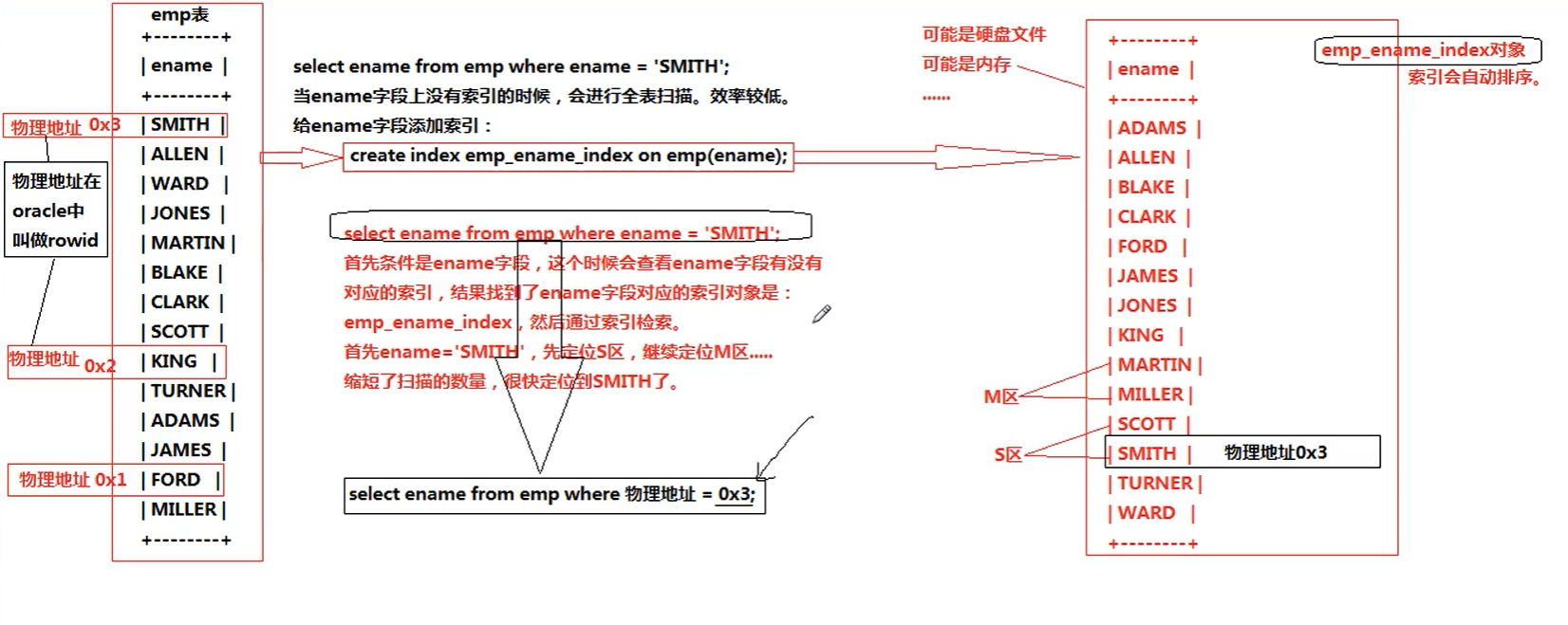 当ename字段上添加索引的时候,以上sql语句会根据索引扫描,快速定位。